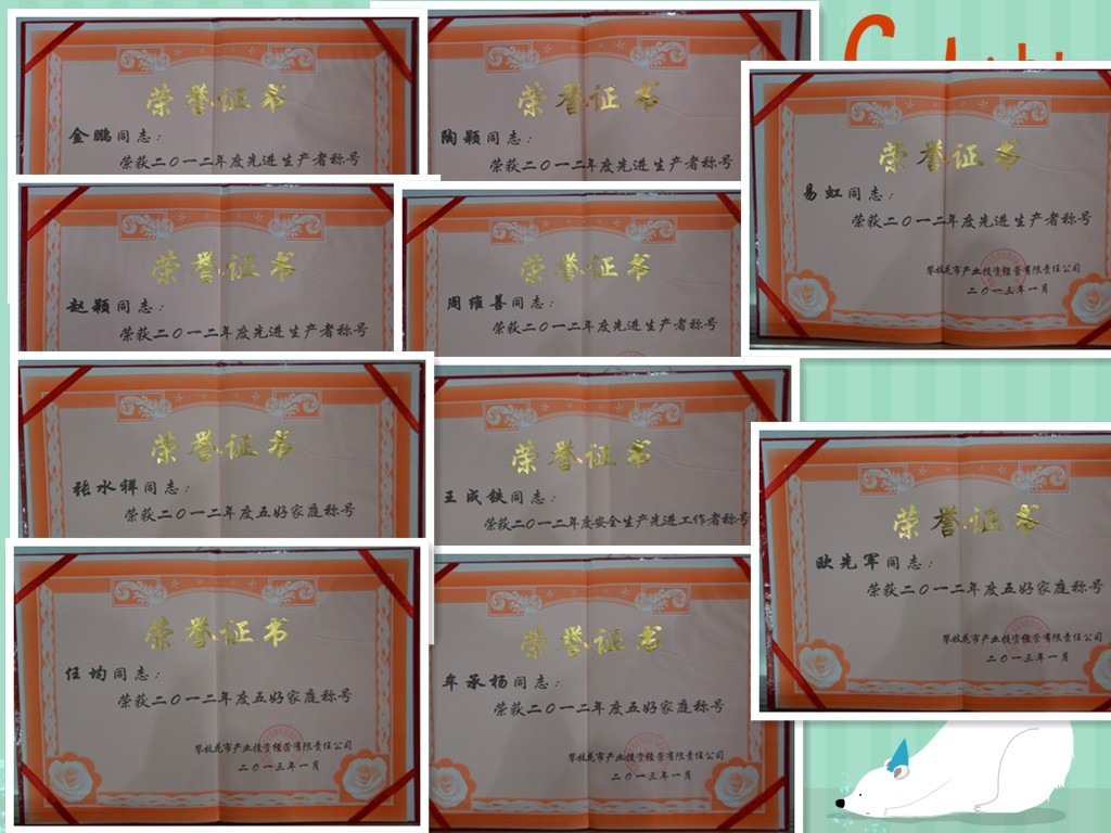 榮獲二○一二年度“先進(jìn)生產(chǎn)者”稱號:陶穎、金鵬、周維善、趙穎、易虹