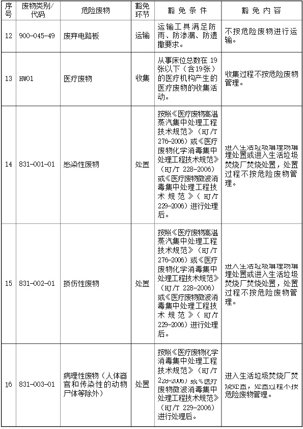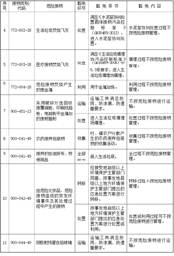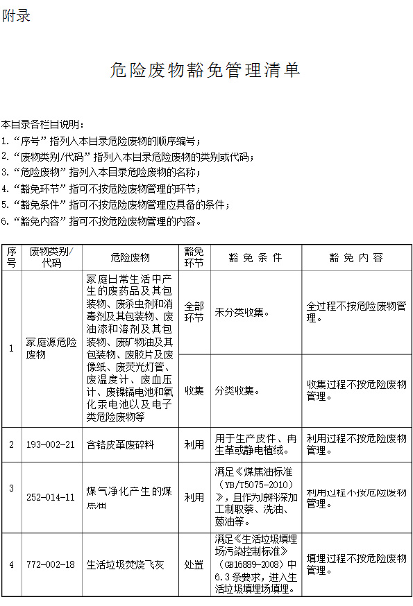第五條 列入本名錄附錄《危險廢物豁免管理清單》中的危險廢物,在所列的豁免環(huán)節(jié),且滿足相應(yīng)的豁免條件時,可以按照豁免內(nèi)容的規(guī)定實行豁免管理。