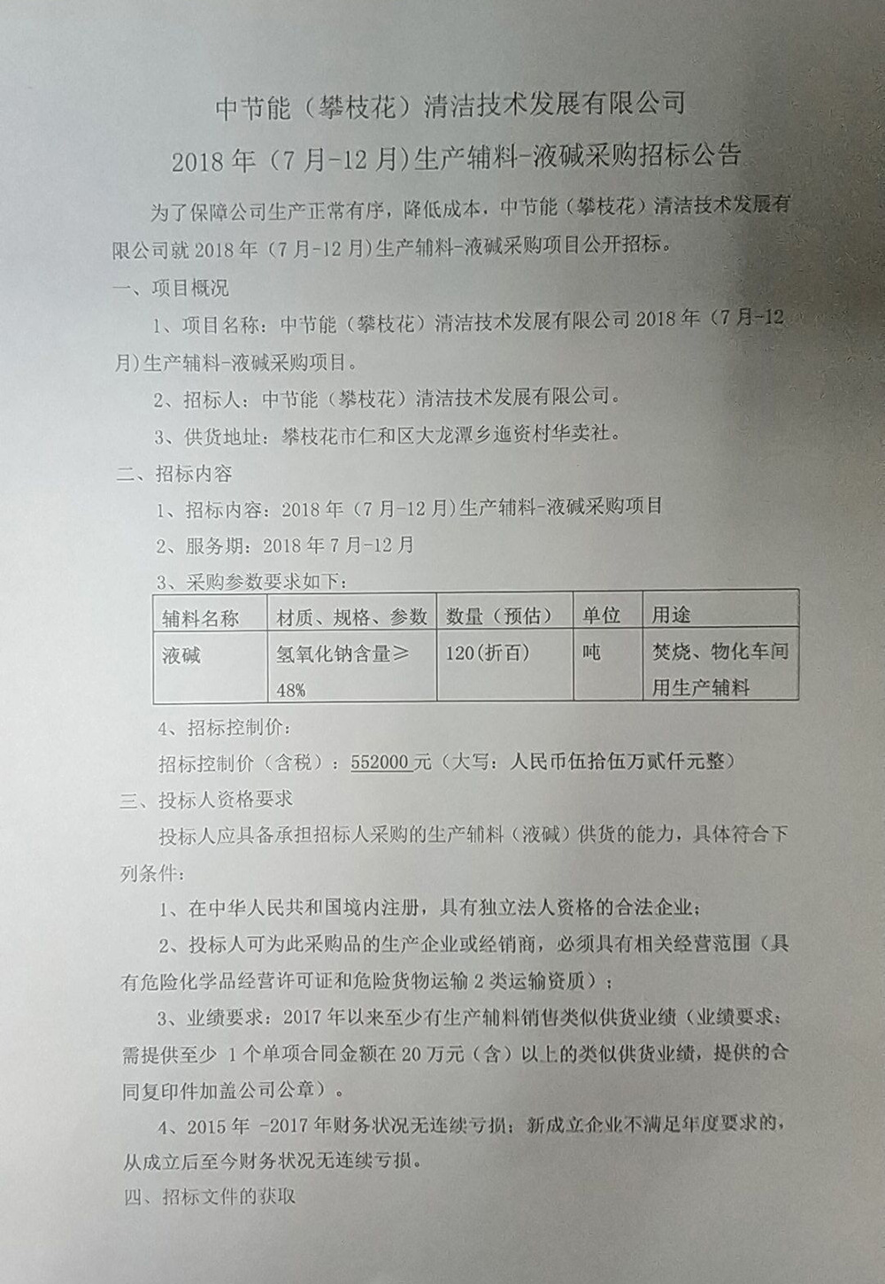 生產(chǎn)輔料-液堿采購招標(biāo)公示