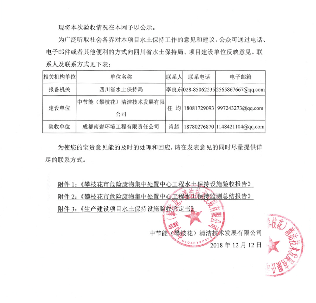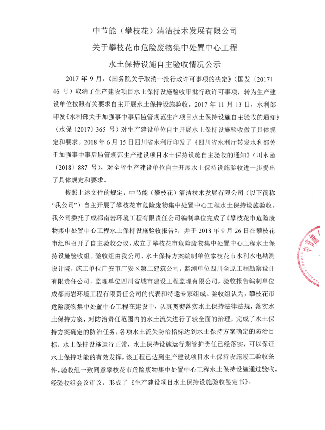 攀枝花市危險廢物集中處置中心工程水土保持設(shè)施自主驗(yàn)收情況公示